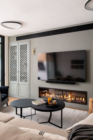 הפרויקט כלל שיפוץ מקיף מהיסוד, החל מהחלפת התשתיות ועד תכנון נגרות מותאמת אישית שסיפקה פתרונות אחסון חכמים. גולת הכותרת של הבית הוא קיר הכוח בסלון, שתוכנן בקפידה כדי לשלב ולספר מספר מערכות חשובות באופן נסתר.